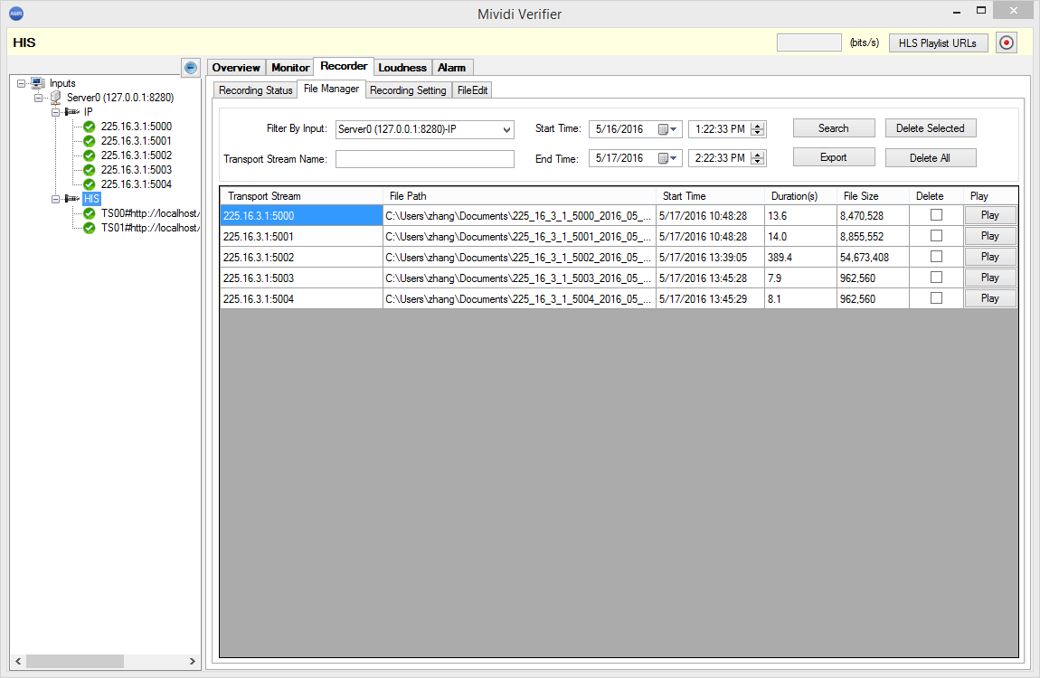用户可以通过配置来选择自动录制所有的传输流或部分传输流中的节目,还可以设置固定的时间段进行自动录制,并按每天、每周或每月的重复在固定时间段录制。录制的文件以标准的传输流格式保存,且每个录制文件的时长可以提前配置,当录制文件的长度达到用户设置的时长时,系统将自动生成另外一个保存文件。